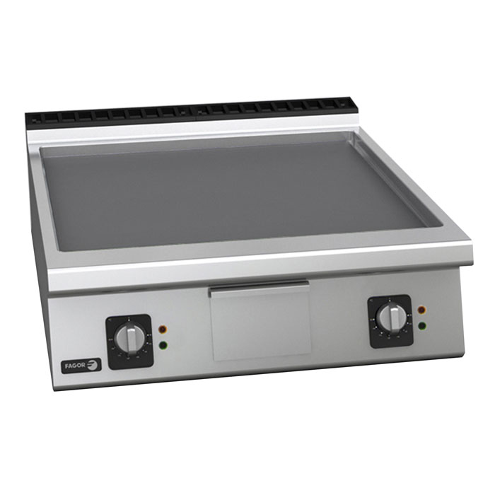 Električni roštilj s glatkom pločom i termostatom FAGOR FT-E910 L s dvije zone grijanja ima snagu od 15,0o kW. Dimenzije ploče su 735 x 640 mm, a cijelog roštilja 800 x 930 x 290 mm.