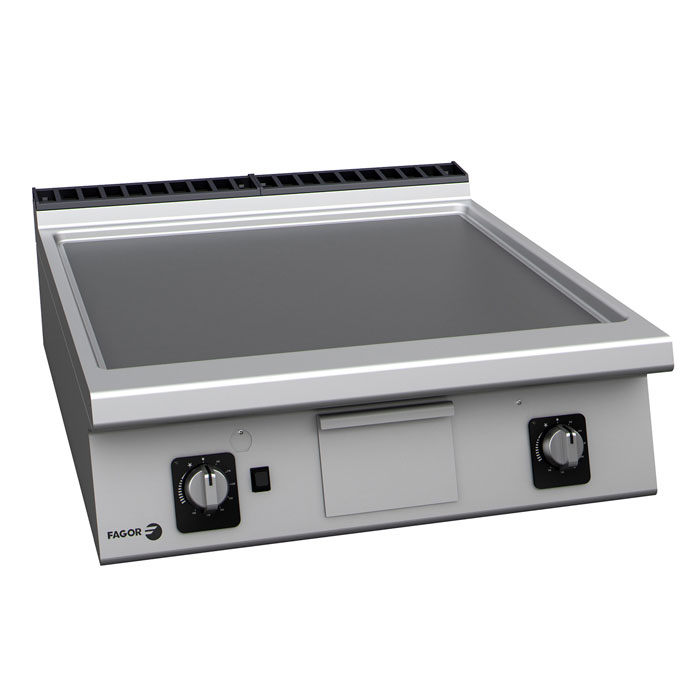 Plinski roštilj s glatkom pločom od kroma i termostatom FAGOR FT-G910 C L s dvije zone grijanja ima snagu od 18,50 kW. Dimenzije ploče su 735 x 640 mm