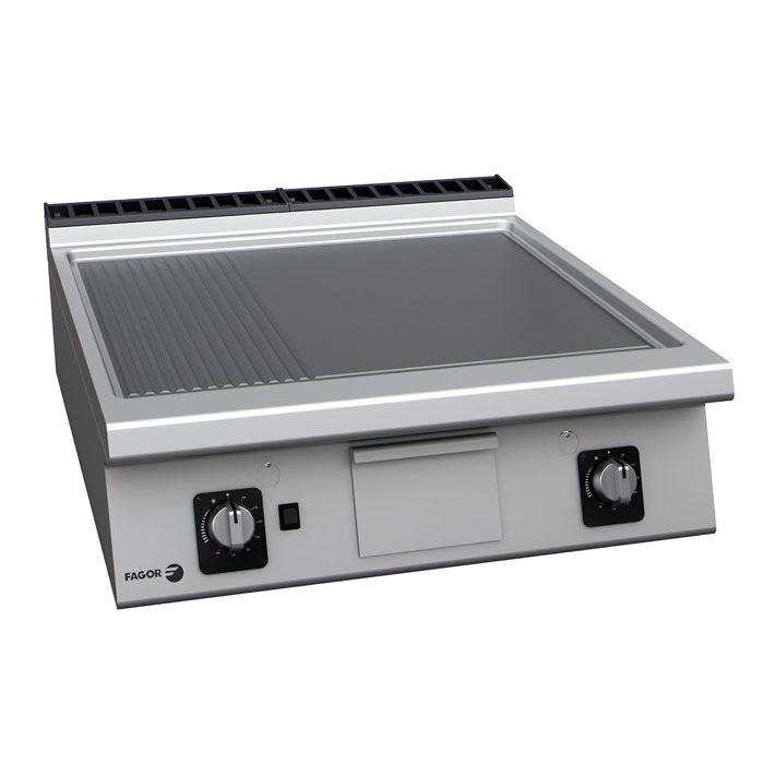 Plinski roštilj s kombiniranom pločom od kroma i termostatom FAGOR FT-G910 C LR s dvije zone grijanja ima snagu od 18,50 kW. Dimenzije ploče su 735 x 640 mm, a cijelog roštilja 800 x 930 x 290 mm.