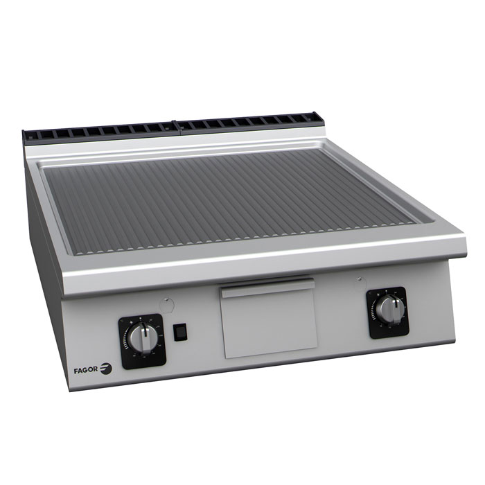 Plinski roštilj s rebrastom pločom (termostat) FAGOR FT-G910 R s dvije zone grijanja ima snagu od 18,50 kW. Dimenzije ploče su 735 x 640 mm