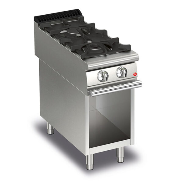 Plinski štednjak na otvorenom kabinetu dubine 900 mm sa dva plamenika ukupne snage 10,5 kW (3,5 kW + 7 kW) savršeno će se uklopiti u svaku kuhinju.