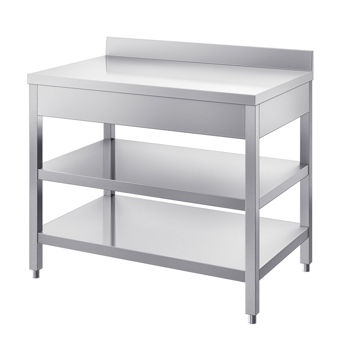 Radni stol dubine 700mm, različitih širina s dvije police i zaštitom za zid – INOX BIM TVR2.xA (oznaka X ovisi o širini odabranog modela)